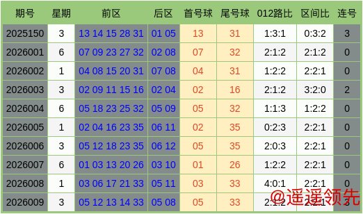 上期回顾:大乐透26009期开出奖号:前区05、12、13、14、33,后区05、08。当期前区号码大小比为1:4,三区比为2:2:1,奇偶比为3:2。后区开出小大、奇偶数。
