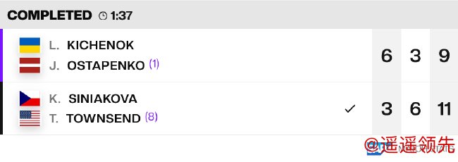 在当日最后结束的一场绿组女双比赛中,8号种子西尼亚科娃/汤森德用时1小时37分钟,在先输一盘的情况下,抢十挽救1个赛点,最终以3-6/6-3/11-9逆转头号种子奇琴诺克/奥斯塔彭科,取得小组赛首胜。