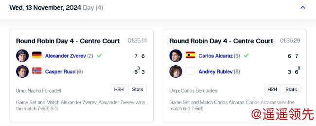 北京时间11月14日凌晨,2024ATP年终总决赛第四日战罢。在男单纽康比组第二轮中,3号种子阿尔卡拉斯赢得本届赛事首胜,2号种子兹维列夫夺得2连胜。