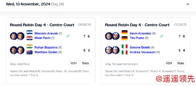 第四日共有4场比赛,包括2场男单纽康比组和2场男双鲍勃-布莱恩组的比赛。